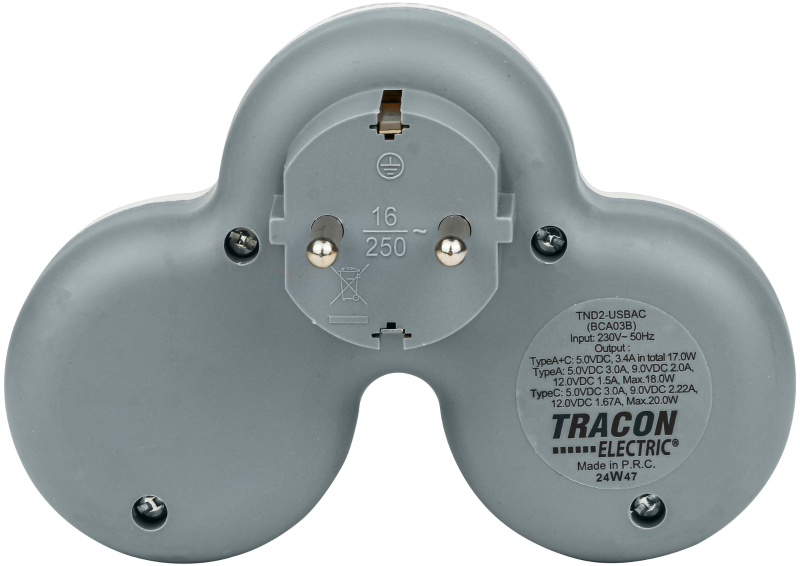 2×SCHUKO, max.16A, 230VAC, 3680W, PP, USB-A+C:5V, 3,4A 17.0W