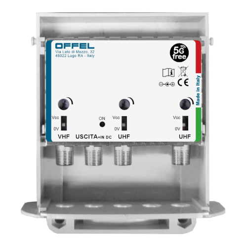 Ogni ingresso è dotato di un trimmer resistivo per la regolazione del guadagno (VHF: 0÷20 dB; UHF: 0÷15 dB) e di un interruttore per l'abilitazione della telealimentazione. La banda VHF si estende dal canale E05 fino al canale E12 compreso (174÷230 MHz). La banda UHF si estende dal canale E21 (470 MHz) al termine della banda UHF. Contenitore schermato in pressofusione di alluminio dotato di connettori a vite tipo F e robusto case in plastica ABS waterproof con alloggio per l'innesto dei cavi. Meccanismo basculante per facilitare il collegamento dei cavi. Accessorio di fissaggio adatto per pali fino a ø 60 mm incluso nella confezione.