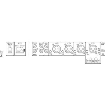 Amplificatore mixer PA mono 1 x 120 W funzionamento silenzioso grazie al raffreddamento senza ventilatore 4 ingressi bilanciati Mic/Line Mic 1 con priorità e auto-talkover contatto supplementare per microfono da tavolo con morsetto a vite 1 ingresso Aux uscite per altoparlanti mediante morsetti uscita Line possibilità di inserimento p. es. di unità per effetti, equalizzatori, controller feedback regolatori di livello delle uscite e degli ingressi regolazione toni a 2 frequenze per l'uscita alimentazione phantom 21 V per ogni ingresso microfono, commutabile singolarmente funzionamento a rete o di emergenza a 24 V angoli di montaggio staccabili