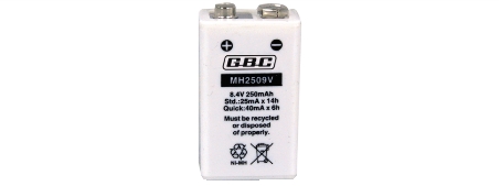 Formato 9V Tensione 8,4 V Capacità (0,2C - 1,1V) 250 mAh Corrente Carica standard 0,25 mA Dimensioni : L x P x H - HT 25,5 x 17 x 48,5 mm Terminali Contatto Peso 46 gr