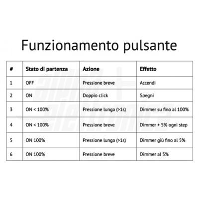 Funzionamento - On/Off da remoto tramite App e da pulsante - Variazione dell'intensità luminosa tramite App e pulsante - Timer di accensione e spegnimento all'orario prestabilito tramite App - Gestione delle scene tramite App