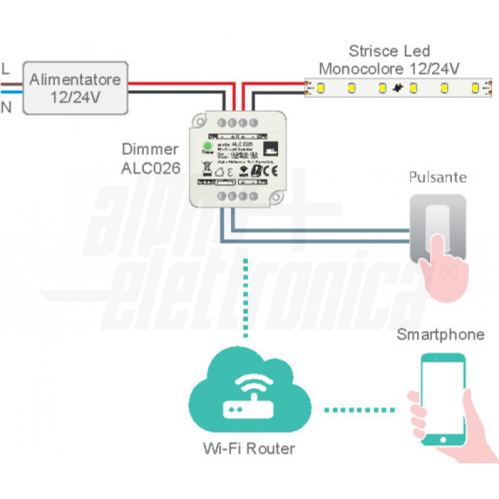 Caratteristiche generali Dimmer monocolore per strisce led e sorgenti led resistive a tensione costante 12V oppure 24V. Il controllo dell’intensità luminosa viene eseguito tramite applicazione SmartLife disponibile per Android e iOS oppure tramite pulsante. Il dimmer funziona tramite pulsante anche senza il collegamento alla rete Wi-Fi. Durante la fase di ricerca della rete Wi-Fi la striscia led collegata lampeggia. Trascorsi 3 minuti dall'accensione se non viene eseguita la connessione alla rete Wi-Fi allora sarà possibile controllare l'uscita tramite il pulsante ma senza memoria e possibilità di impostazioni avanzate.