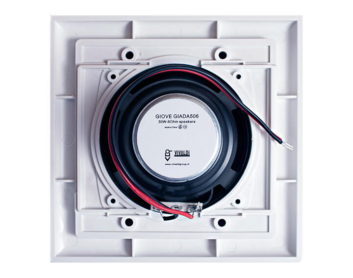 Diffusore quadrato, da incasso, per scatola 506E. Full range, HI-FI. Woofer da 7,5 cm. Membrana in polipropilene. Potenza 30W RMS. Potenza musicale 60W. Potenza di picco 90W. Amplificazione consigliata da 10 a 40W RMS. Impedenza 8 Ω. Risposta in frequenza 65-18000 Hz. Sensibilità 85 dB. Dimensioni (LxHxP) 125x125x48 mm. Peso 0,35 Kg. Incasso su scatola di derivazione 506E. Colore bianco RAL9016. Temperatura di lavoro da -20° a +65°.