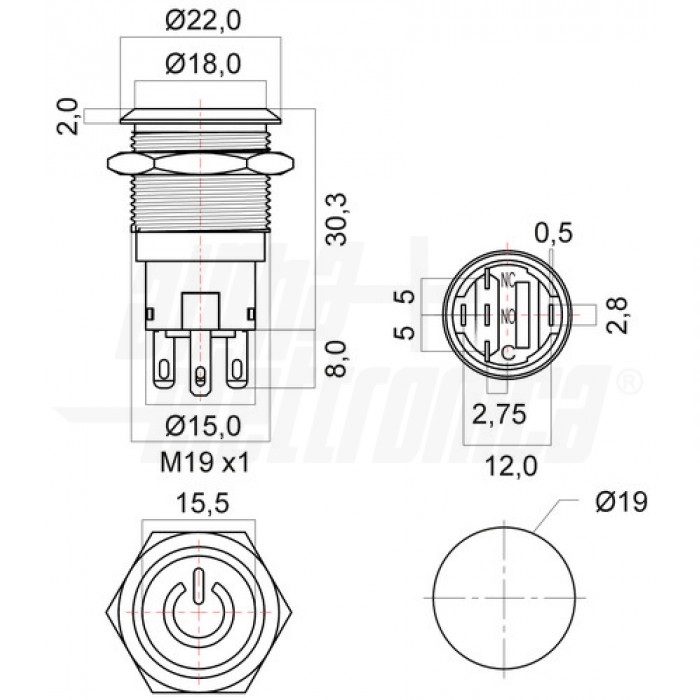 Interruttore antivandalo ø19mm bistabile luminoso - 1P - SPDT - ON/ON - 5 term. a saldare