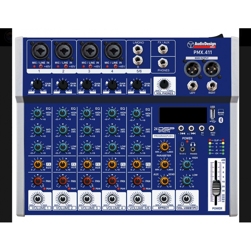 -4 Ingressi mono -1 Ingresso Line Stereo (Jack sbilanciato) -1 Ingresso USB/BT o collegamento PC / MAC (funzione Sound Card In-Out) - EQ +/- 15 dB (Alti 15 KHz - Medi 2,5 KHz - Bassi 80 Hz) su tutti gli ingressi - Indicatore di picco sugli ingressi Mono e Stereo - Regolazione del livello effetti sui canali Mic e Line - Regolazione del livello effetti sul Main - Multi effetto DSP 24 effetti incluso 4 tipi di Reverbero - Alimentazione + 48 V Phantom - Uscita Stereo Main (XLR bilanciati e Jack sbilanciati) - Uscita FX/ Aux (Jack sbilanciato) con regolazione del livello - Uscita Stereo cuffie (Jack stereo) con regolazione del livello - Ingresso Mic Jack 3,5 (in parallelo al Ch 2) - Alimentazione USB 5 V
