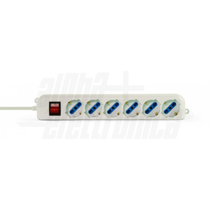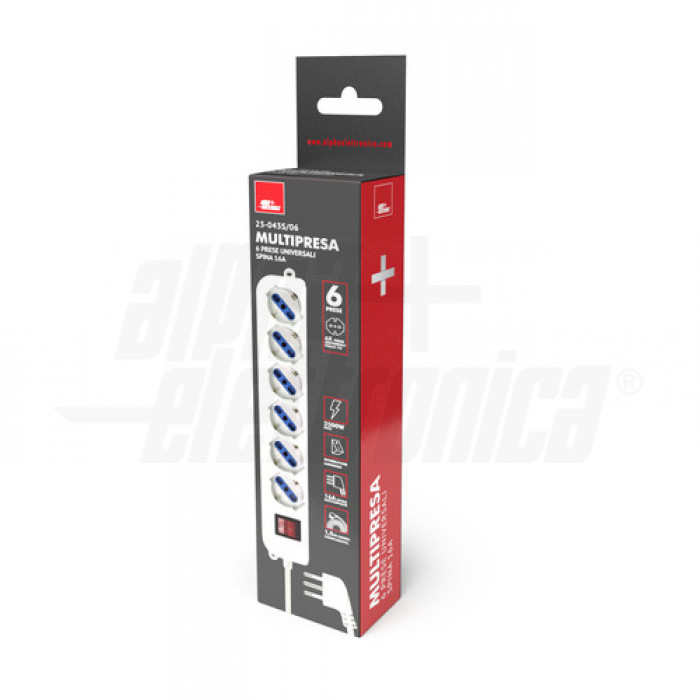 -N. prese Universali 2P+T 10/16A 6 -Tipo di prese Universale Italia P40 -Numero di Prese Totali 6 -Tipo di spina Italia 16A 2P+T S17 a 90° -Prese 6 Universali 2P+T 10/16A -Accensione Con interruttore luminoso -Cavo 1,5 m -Tensione max 250 V -Marca Alpha Elettronica