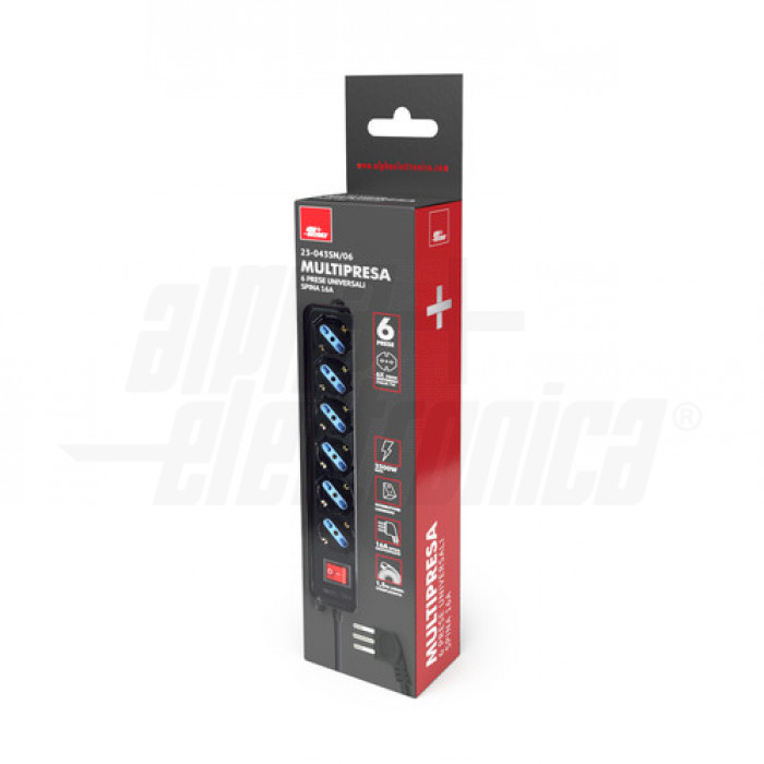-N. prese Universali 2P+T 10/16A 6 -Tipo di prese Universale Italia P40 -Numero di Prese Totali 6 -Tipo di spina Italia 16A 2P+T S17 a 90° -Prese 6 Universali 2P+T 10/16A -Accensione Con interruttore luminoso -Cavo 1,5 m -Tensione max 250 V