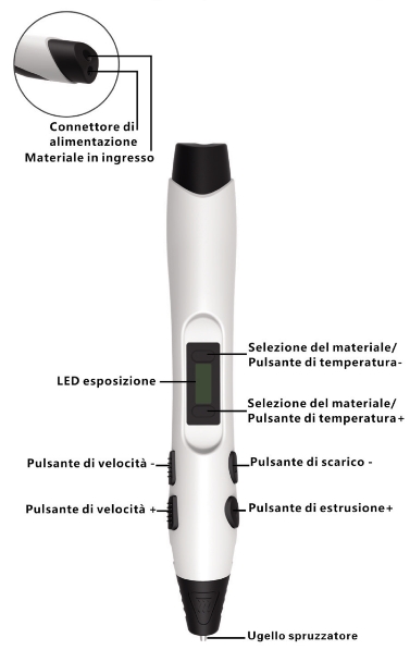 PENNA STAMPANTE 3D Penna intelligente 3D con stampa stereoscopica 3.0.E' la penna 3D più leggera in commercio con i suoi 55g di peso. Anche i non professionisti possono disegnare utilizzando questa penna 3D grazie al semplice utilizzo. Controllo digitale della temperatura e della velocità di estrusione del filamento. Ugello brevettato riscaldante, staccabile per una più facile manutenzione. Adatto per filamenti in WOOD, ABS, e PLA 1,75mm. La confezione comprende: 1 Penna 3D, 1 alimentatore, 1 base d'appoggio per la penna e 2 rotoli da 5m di filamenti (1 in ABS e 1 in PLA).