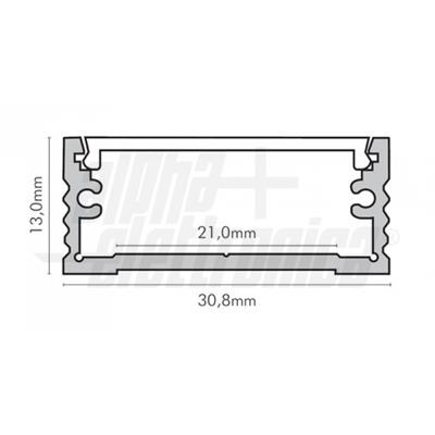 Il profilo illustrato è un componente. Il suo corretto funzionamento con nastri led o moduli led dipende da importanti requisiti di installazione e dimensionamento. La potenza dissipabile è stata calcolata considerando una temperatura ambiente non superiore a 35°C in aria. Condizioni di installazione differenti devono essere opportunamente verificate da personale tecnico. Utilizzare la copertura solo con nastri led IP20. Alpha Elettronica declina ogni responsabilità per danni o malfunzionamenti derivati da un uso inappropriato del profilo. Lunghezza profilo 2 m Potenza dissipabile (35°C) 30 W/m Larghezza interna 21 mm Altezza 13 mm Colore corpo Naturale Grado di protezione IP20 Larghezza 30,8 mm