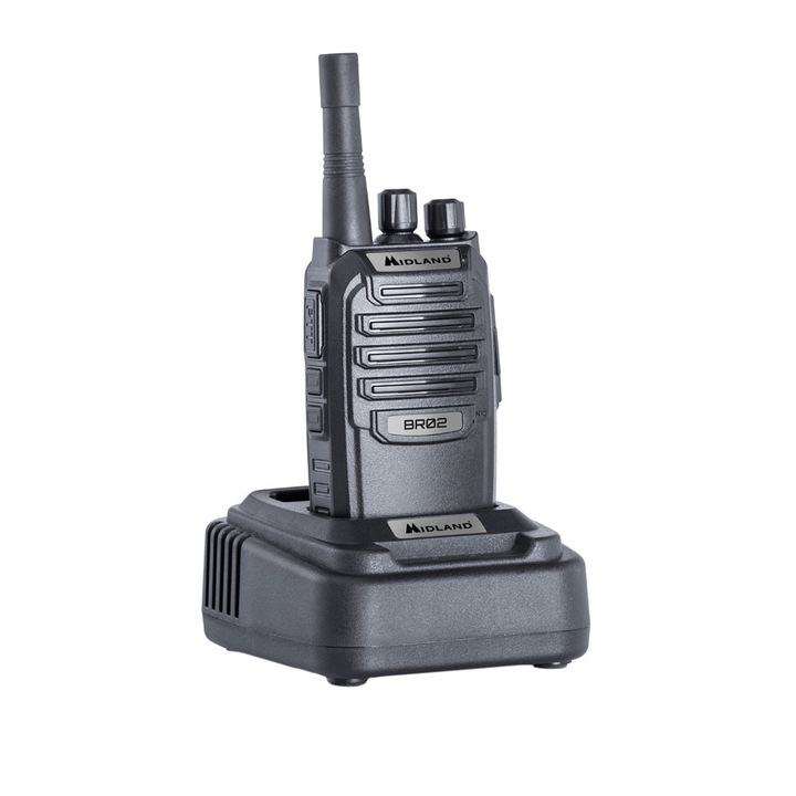 Midland BR02 è dotato di una funzione di squelch con 10 livelli regolabili . Questo sistema sopprime il rumore sul canale in uso; più alto è il livello impostato, più segnali deboli vengono soppressi. Il livello 0 disattiva lo squelch, mentre il BR01 è impostato di default sul livello 4 . Questo modello ha una portata da 1 a 2 km in aree urbane . In ambienti aperti con alberi e case, può aumentare fino a 4 km. Per l'uso in terreni pianeggianti, la portata massima è di 12 km .