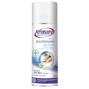 Il nuovo Spary Ariasana è un disinfettante rivoluzionario e unico che rimuove rapidamente germi, batteri, muffe e funghi da innumerevoli ambienti, superfici e tessuti di arredo, garantendo igiene e sicurezza.Ariasano Spray Disinfettante multiuso è un presidio medico chirurgico che permette di uccidere il 99,99% dei batteri e neutralizzare i cattivi odori rinfrescando l'ambiente con la delicata profumazione al mentolo ed eucalipto.Adatto per l'igienizzazione di condizionatori di casa e auto.