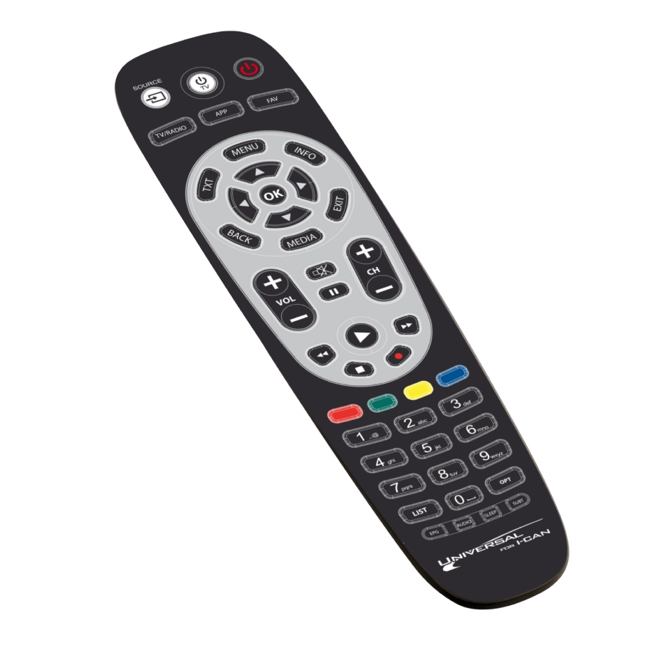 Telecomando universale per Decoder I-Can + TV Learning (funzioni base). Tipo di programmazione: Ricerca Manuale e Ricerca Automatica. Alimentazione batterie 2x AAA (NON incluse). Non perde la memoria durante la sostituzione delle batterie.